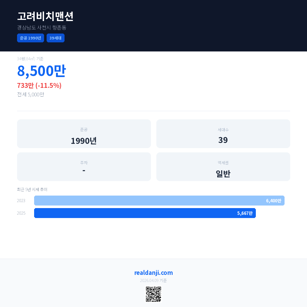 고려비치맨션 국민평형 기준 2025년 평균 거래가는 5,667만으로, 전년 대비 11.5% 하락 했습니다.