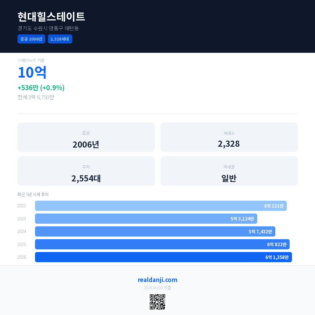 현대힐스테이트 국민평형 기준 2026년 평균 거래가는 6억 1,358만으로, 전년 대비 0.9% 상승 했습니다.