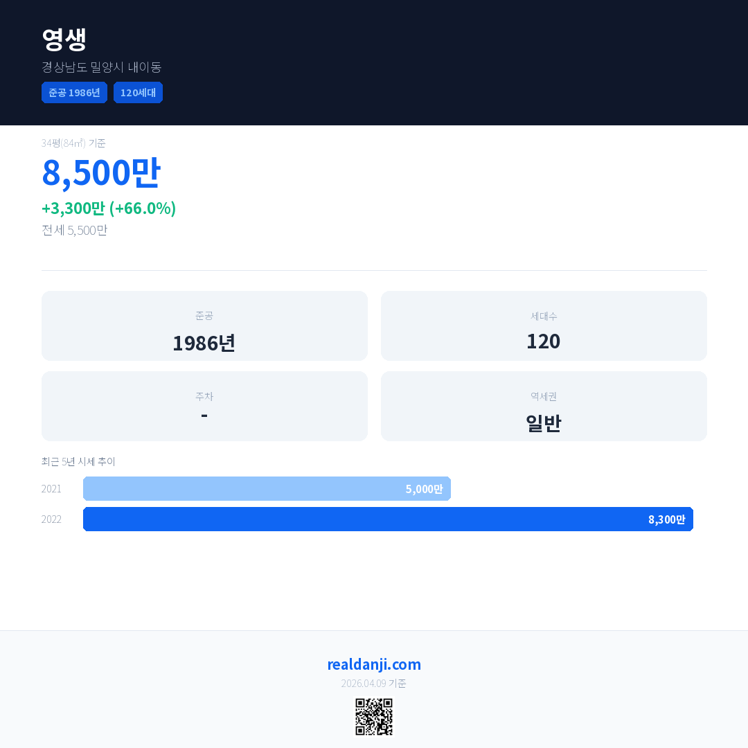 영생 국민평형 기준 2022년 평균 거래가는 8,300만으로, 전년 대비 66.0% 상승 했습니다.