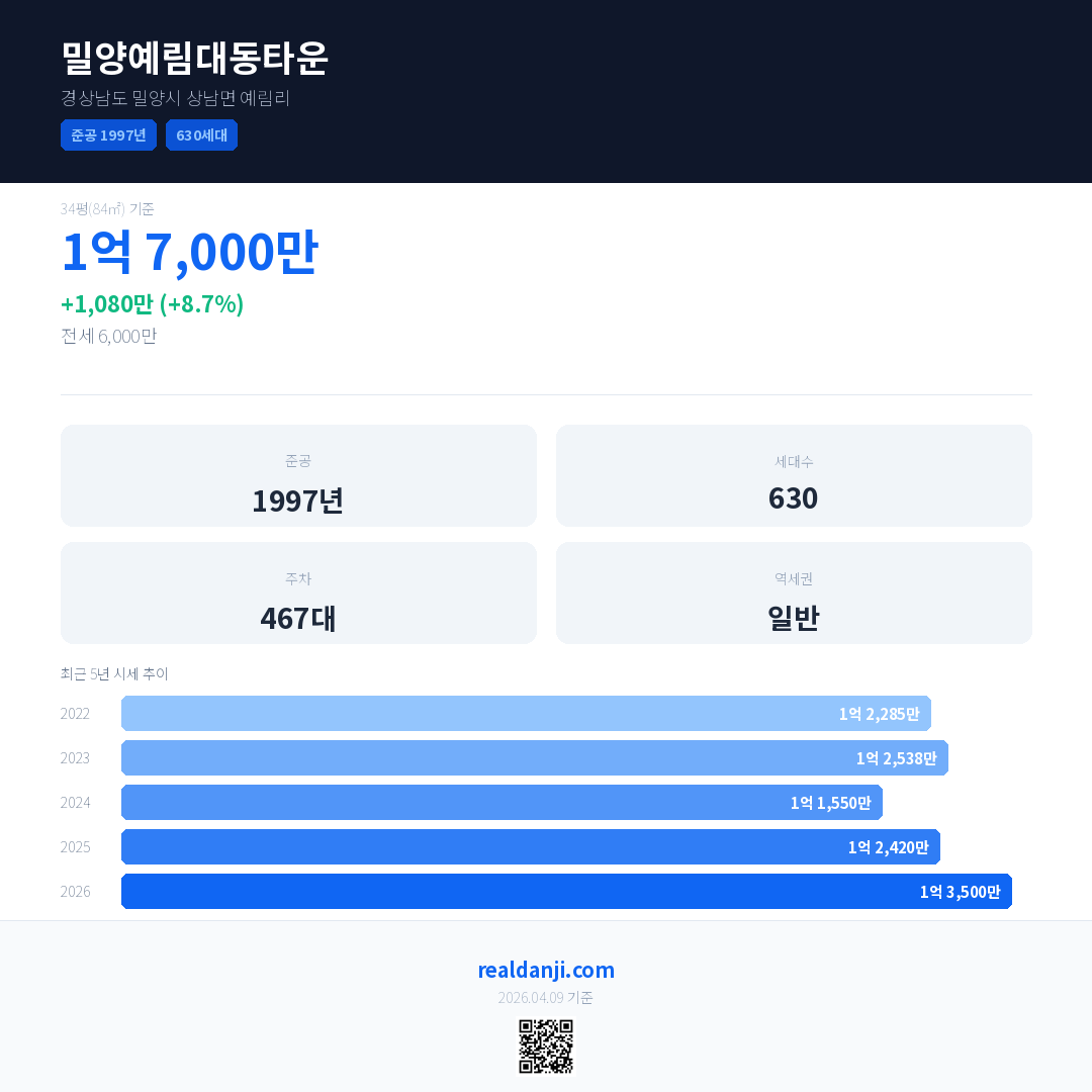 밀양예림대동타운 국민평형 기준 2026년 평균 거래가는 1억 3,500만으로, 전년 대비 8.7% 상승 했습니다.