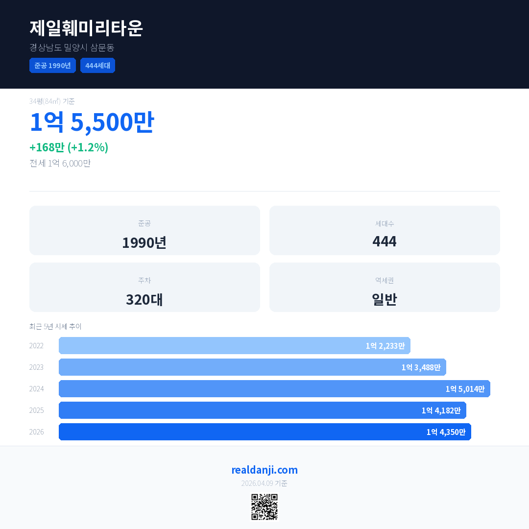 제일훼미리타운 국민평형 기준 2026년 평균 거래가는 1억 4,350만으로, 전년 대비 1.2% 상승 했습니다.