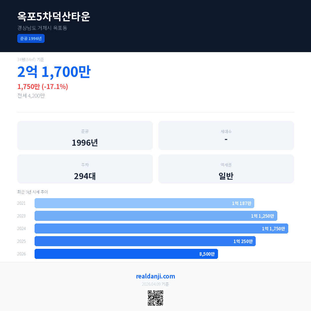 옥포5차덕산타운 국민평형 기준 2026년 평균 거래가는 8,500만으로, 전년 대비 17.1% 하락 했습니다.