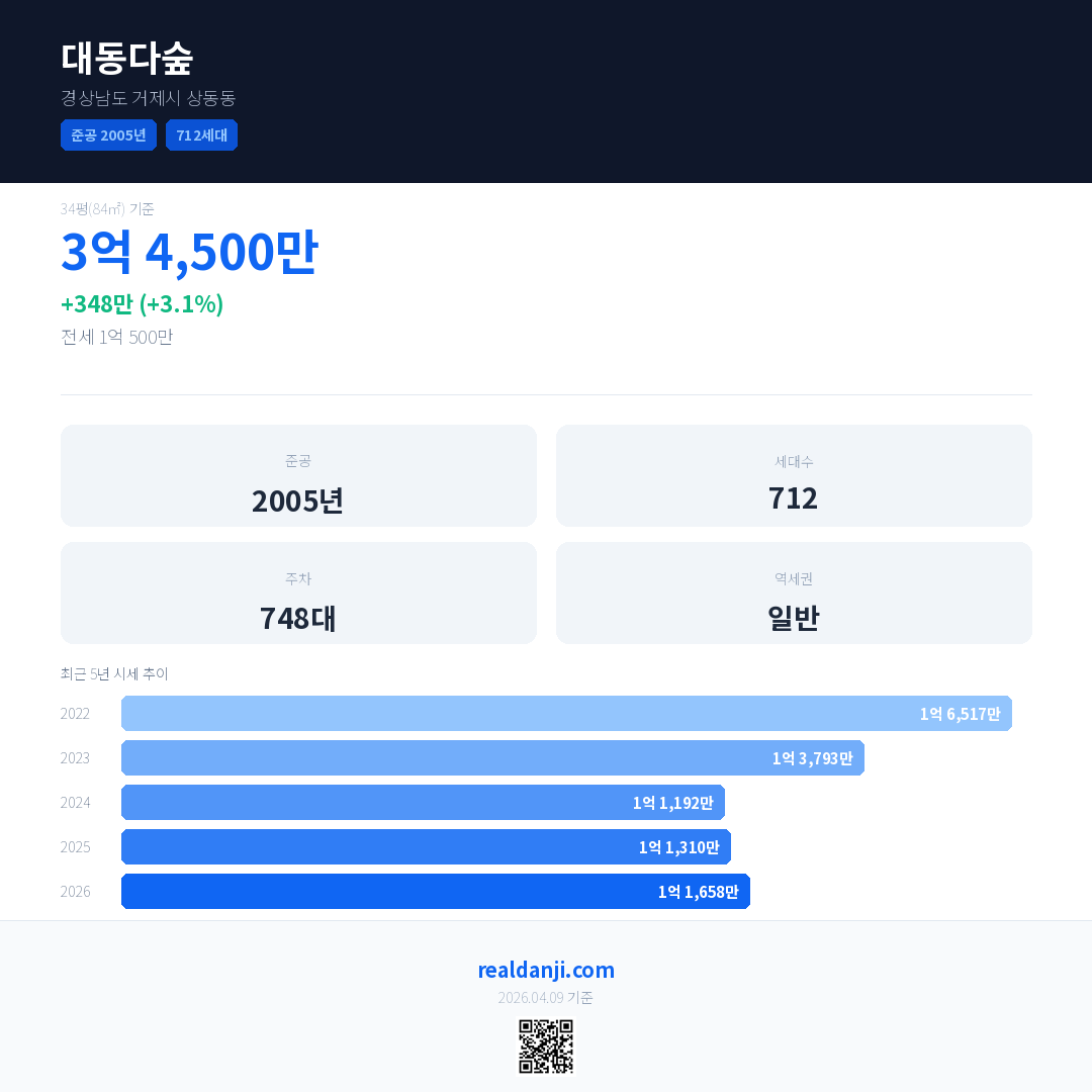 대동다숲 국민평형 기준 2026년 평균 거래가는 1억 1,658만으로, 전년 대비 3.1% 상승 했습니다.