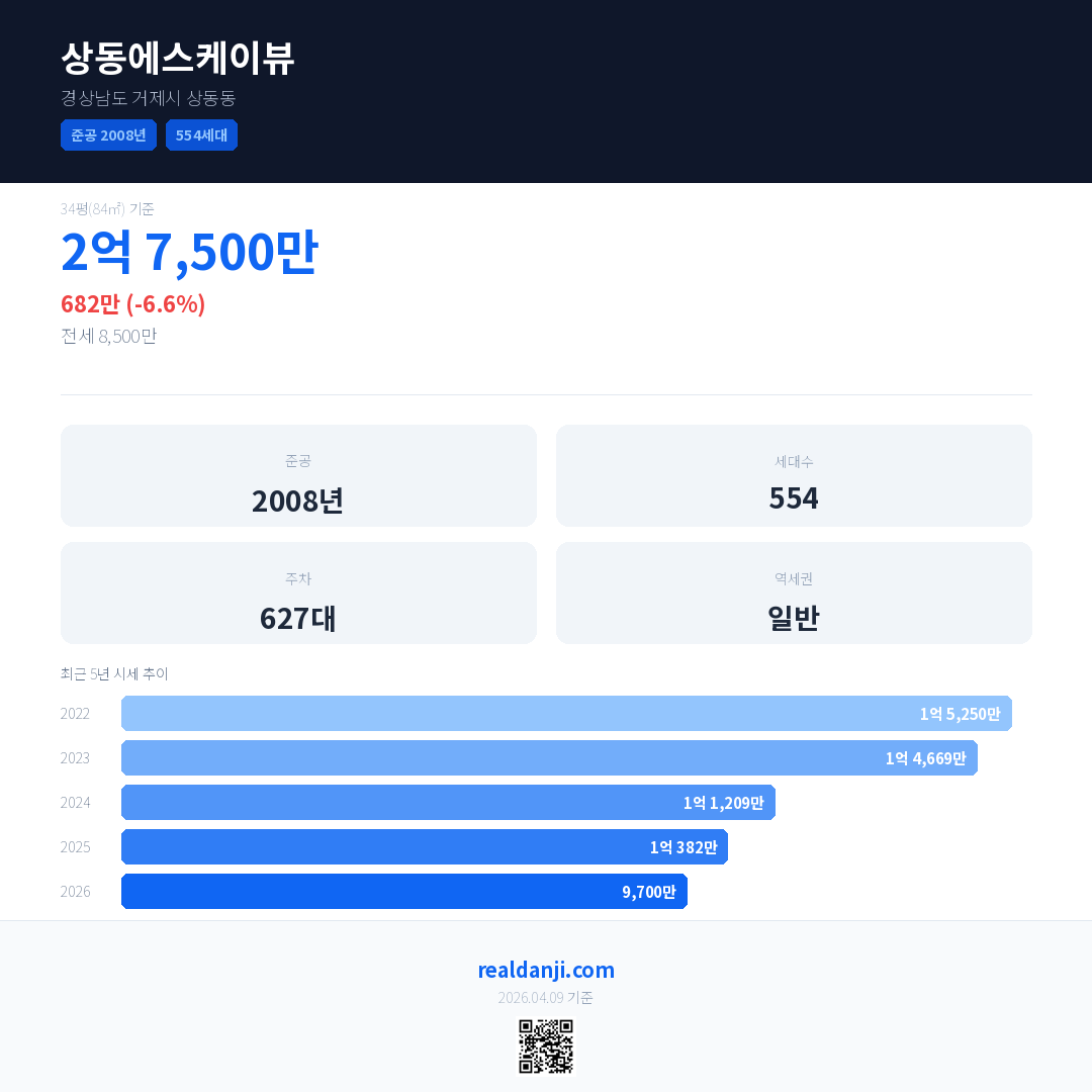 상동에스케이뷰 최근 거래가는 2억 7,500만입니다. (2026-02)