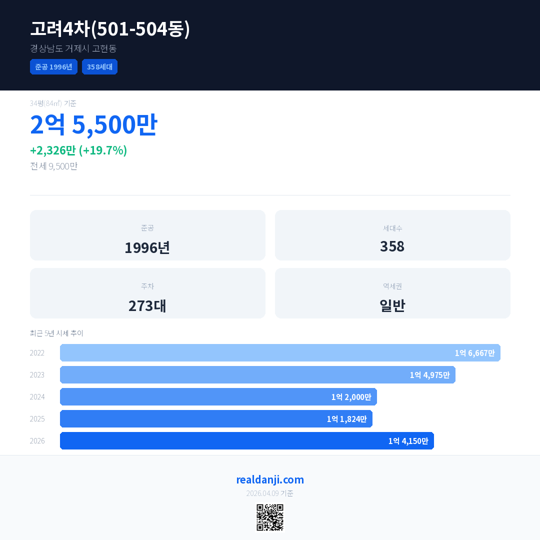 고려4차(501-504동) 최근 거래가는 2억 5,500만입니다. (2026-03)