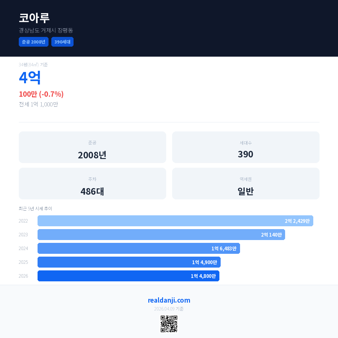 코아루 최근 거래가는 4억입니다. (2026-02)