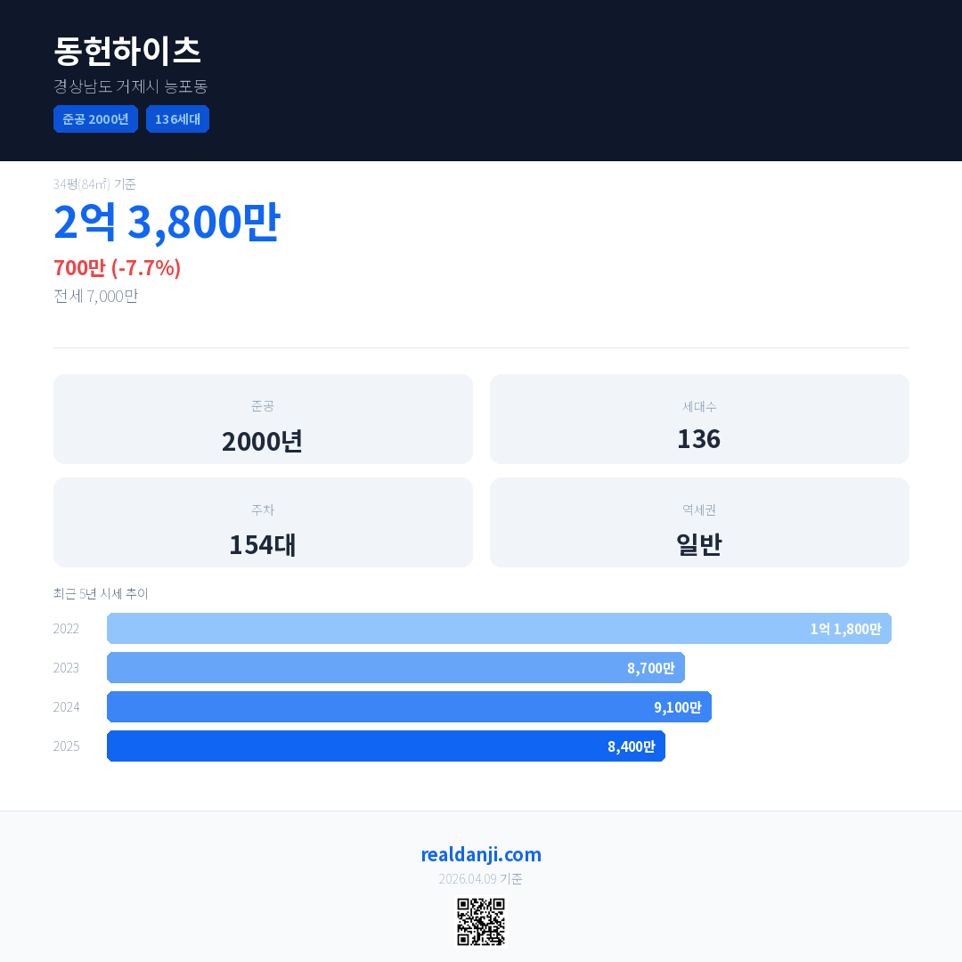 동헌하이츠 국민평형 기준 2025년 평균 거래가는 8,400만으로, 전년 대비 7.7% 하락 했습니다.