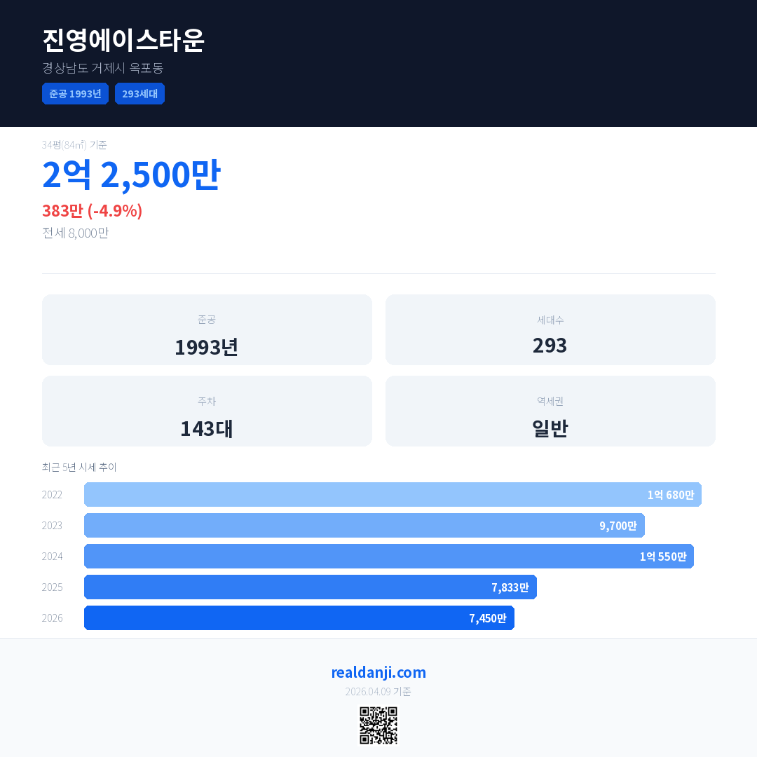 진영에이스타운 국민평형 기준 2026년 평균 거래가는 7,450만으로, 전년 대비 4.9% 하락 했습니다.
