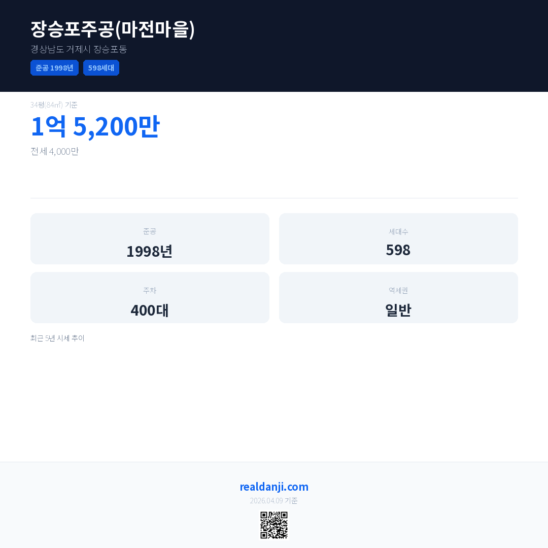 장승포주공(마전마을) 최근 거래가는 1억 5,200만입니다. (2026-03)