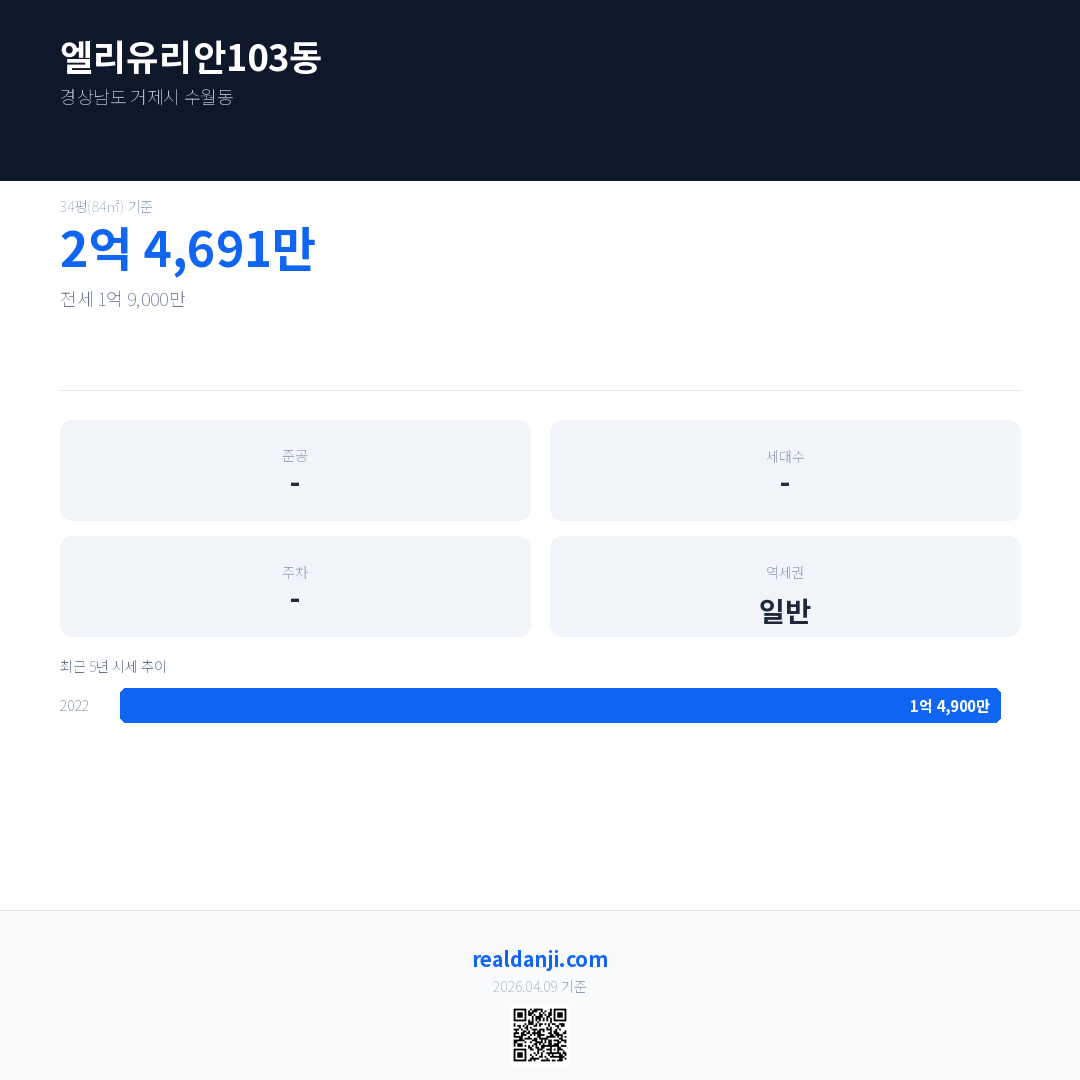 엘리유리안103동 최근 거래가는 2억 4,691만입니다. (2022-01)