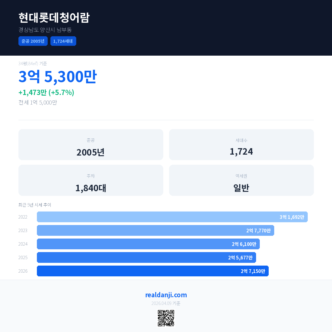 현대롯데청어람 국민평형 기준 2026년 평균 거래가는 2억 7,150만으로, 전년 대비 5.7% 상승 했습니다.