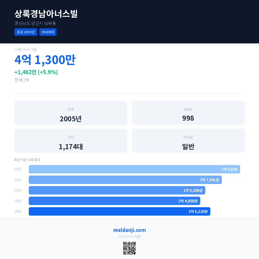 상록경남아너스빌 최근 거래가는 4억 1,300만입니다. (2026-04)