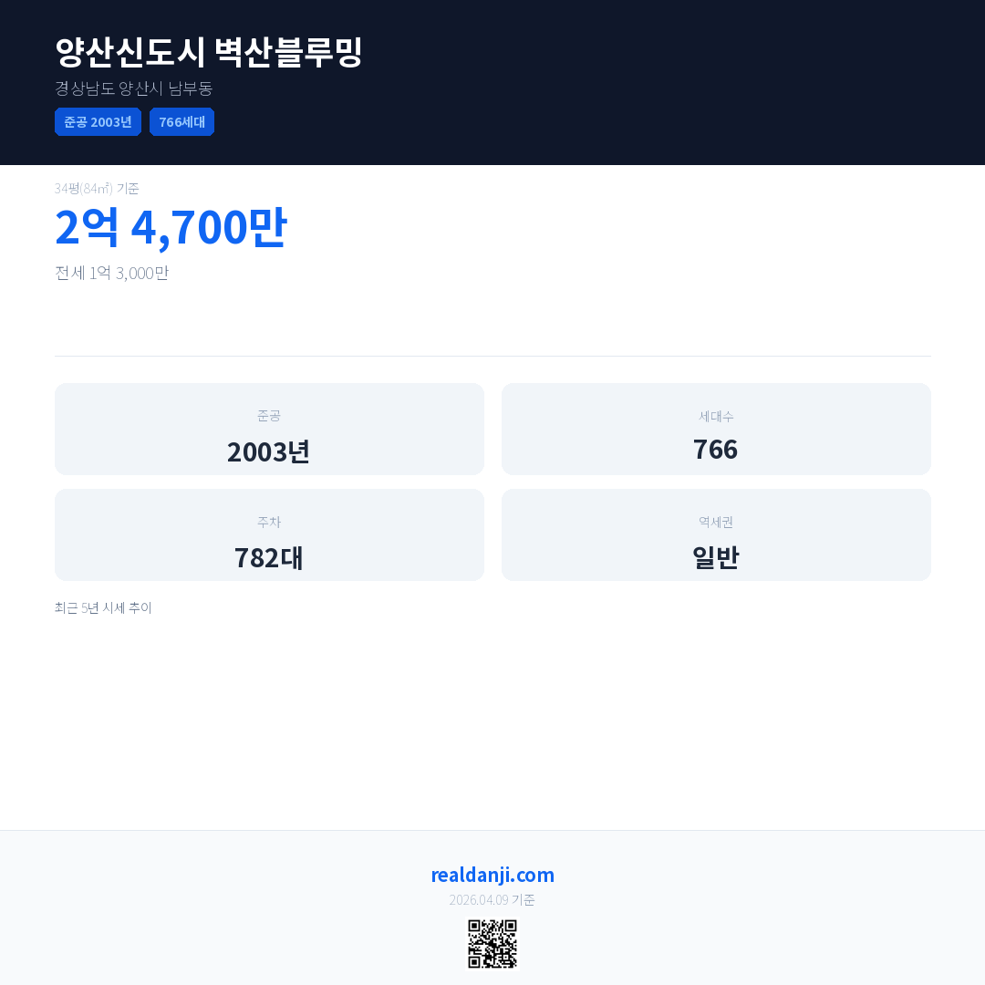 양산신도시 벽산블루밍 최근 거래가는 2억 4,700만입니다. (2026-04)