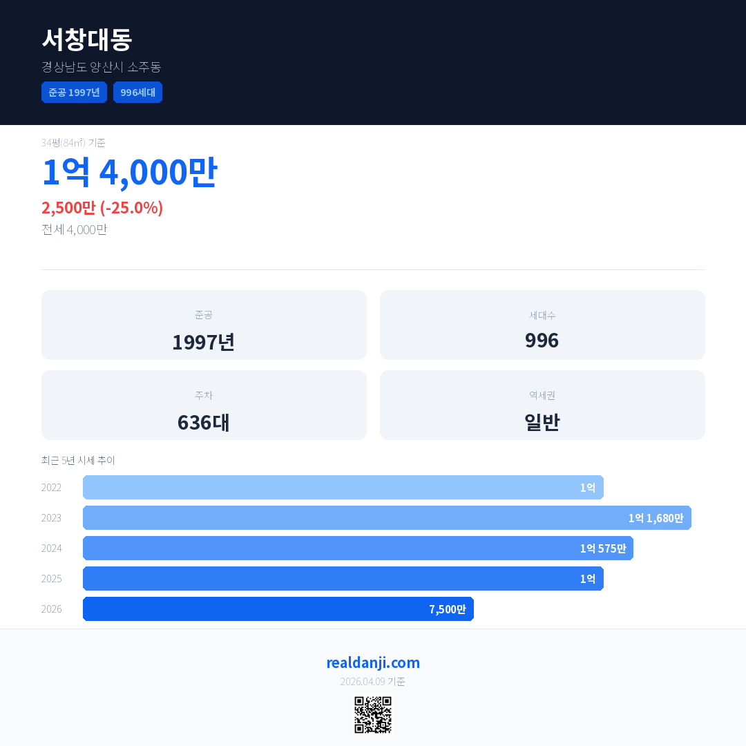 서창대동 국민평형 기준 2026년 평균 거래가는 7,500만으로, 전년 대비 25.0% 하락 했습니다.