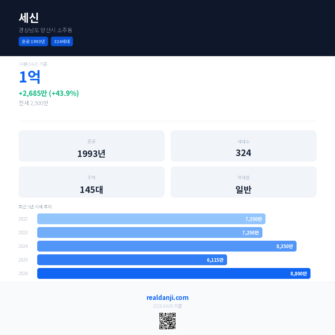 세신 국민평형 기준 2026년 평균 거래가는 8,800만으로, 전년 대비 43.9% 상승 했습니다.