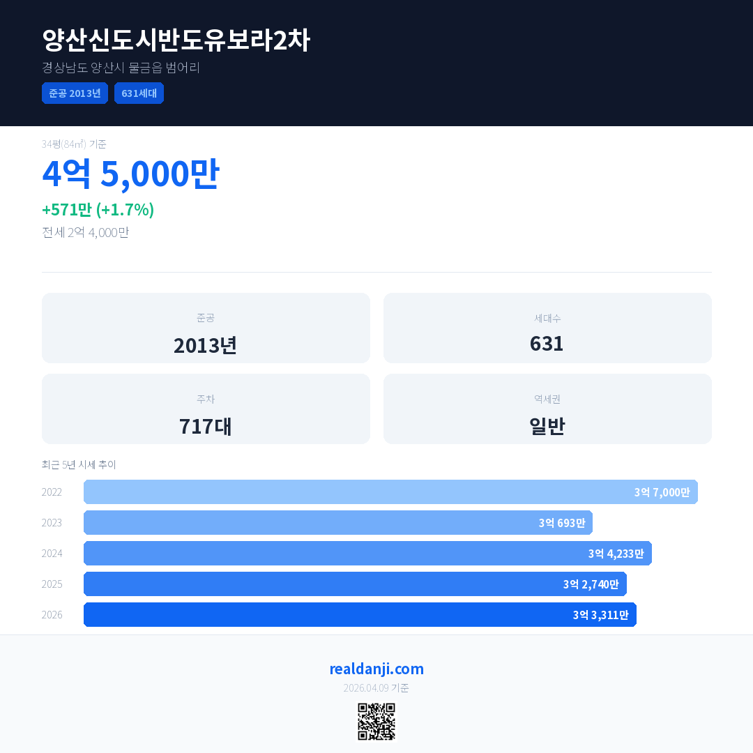양산신도시반도유보라2차 최근 거래가는 4억 5,000만입니다. (2026-04)