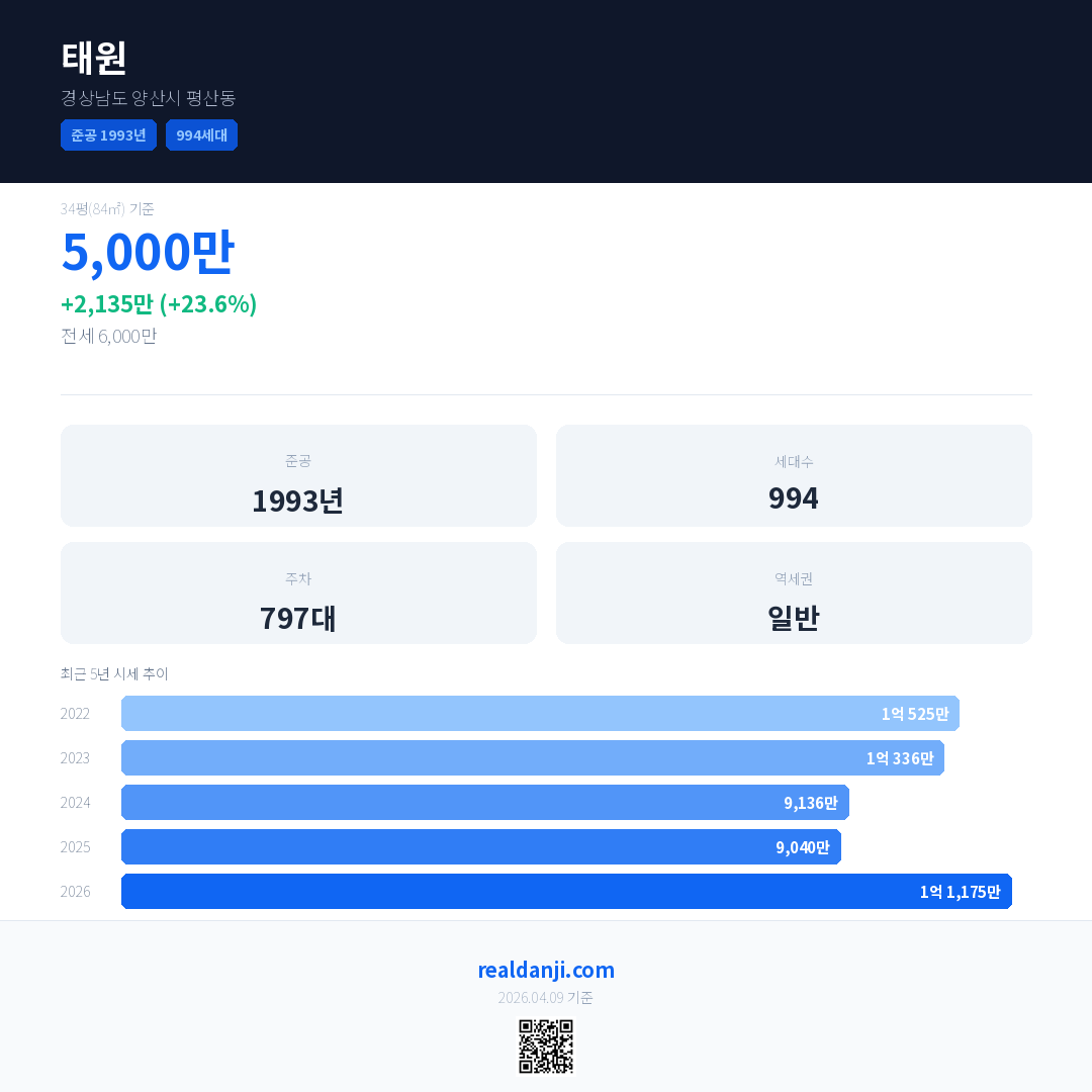 태원 국민평형 기준 2026년 평균 거래가는 1억 1,175만으로, 전년 대비 23.6% 상승 했습니다.