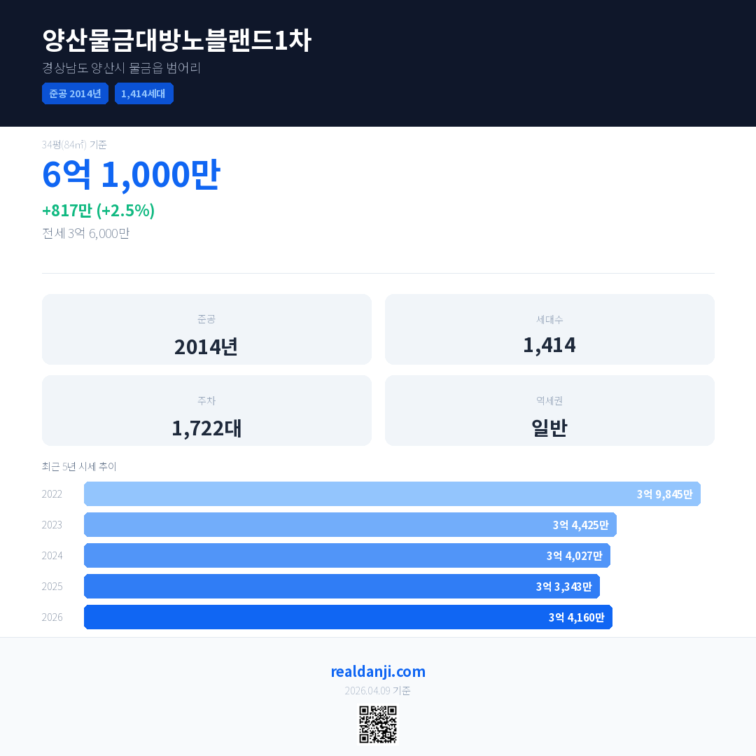 양산물금대방노블랜드1차 최근 거래가는 6억 1,000만입니다. (2026-04)