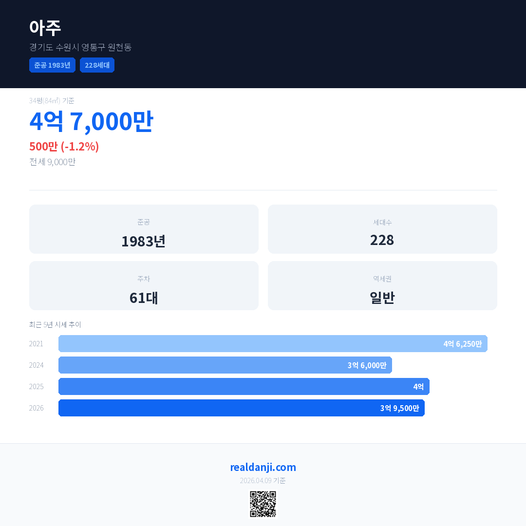 아주 국민평형 기준 2026년 평균 거래가는 3억 9,500만으로, 전년 대비 1.2% 하락 했습니다.