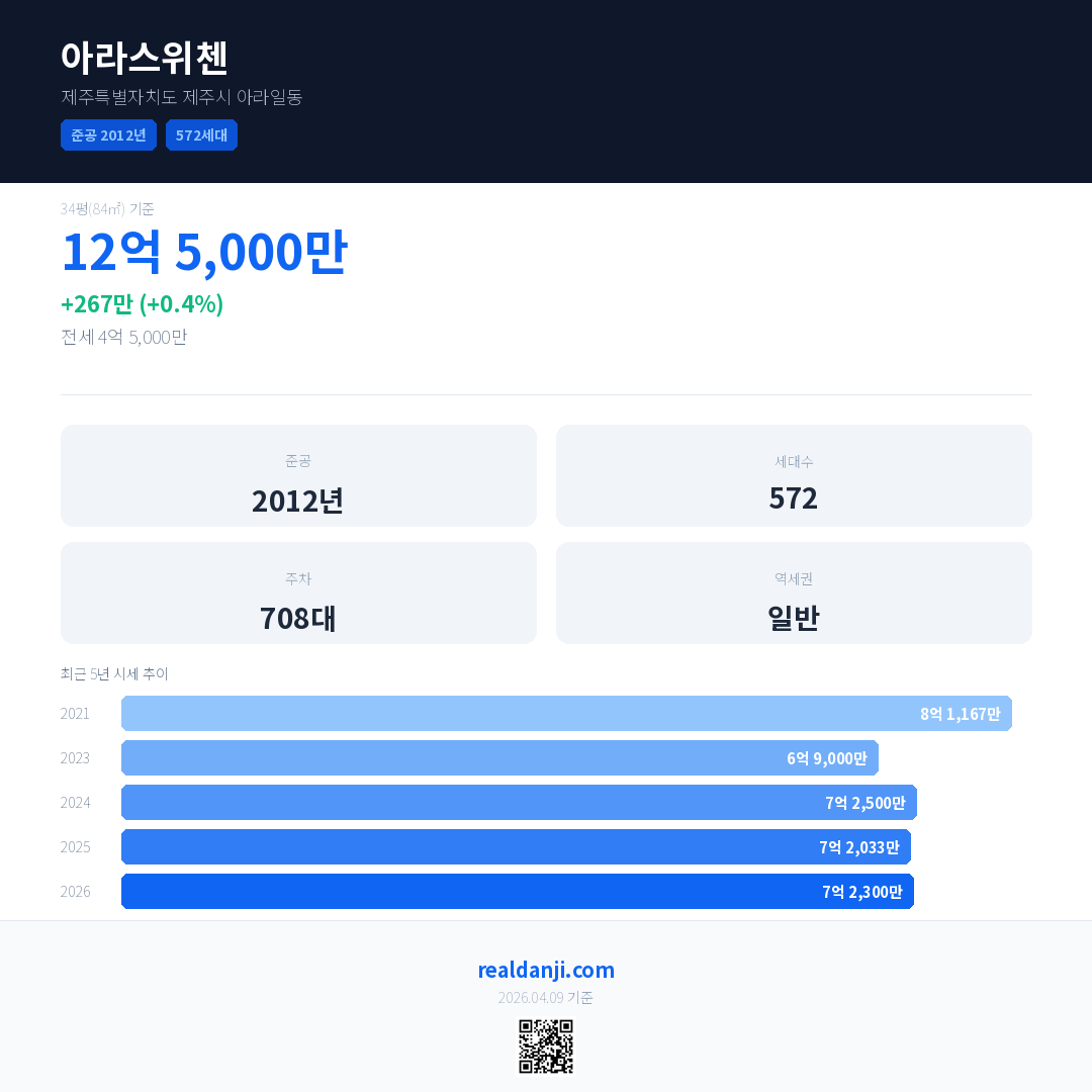 아라스위첸 국민평형 기준 2026년 평균 거래가는 7억 2,300만으로, 전년 대비 0.4% 상승 했습니다.