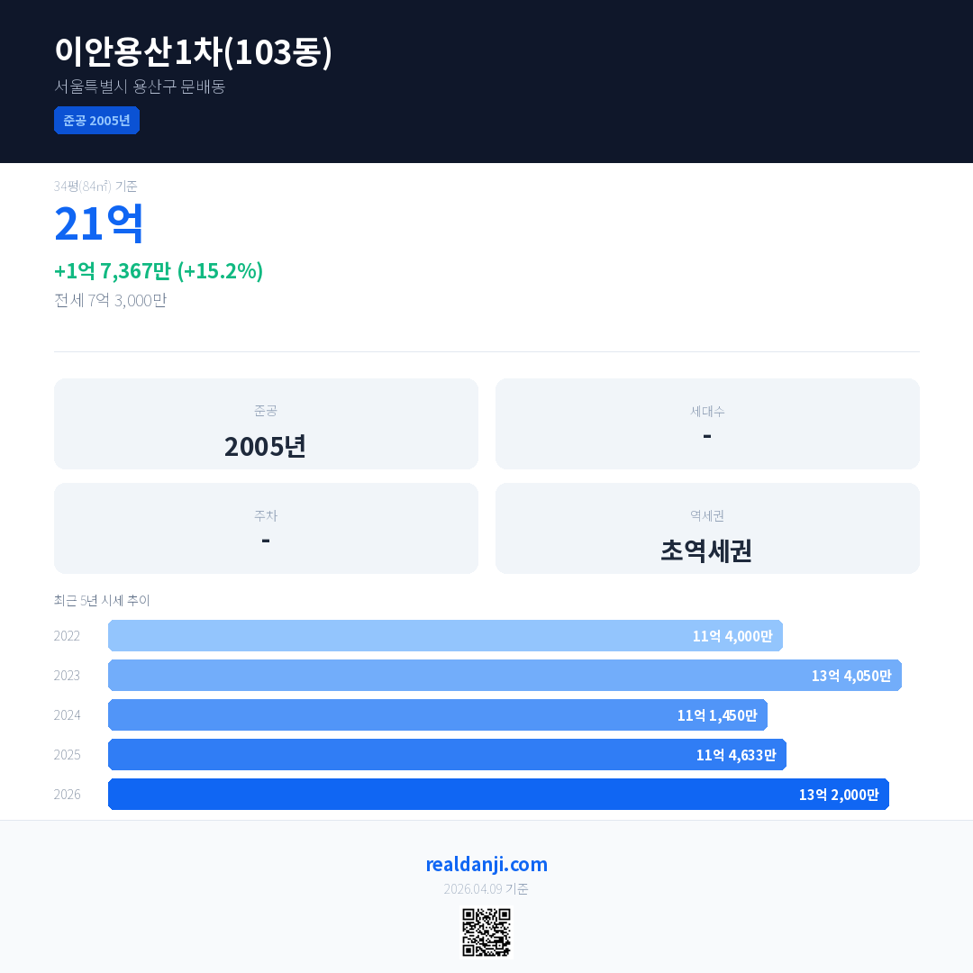 이안용산1차(103동)은(는) 2005년에 준공되었으며, 현재 21년차입니다.