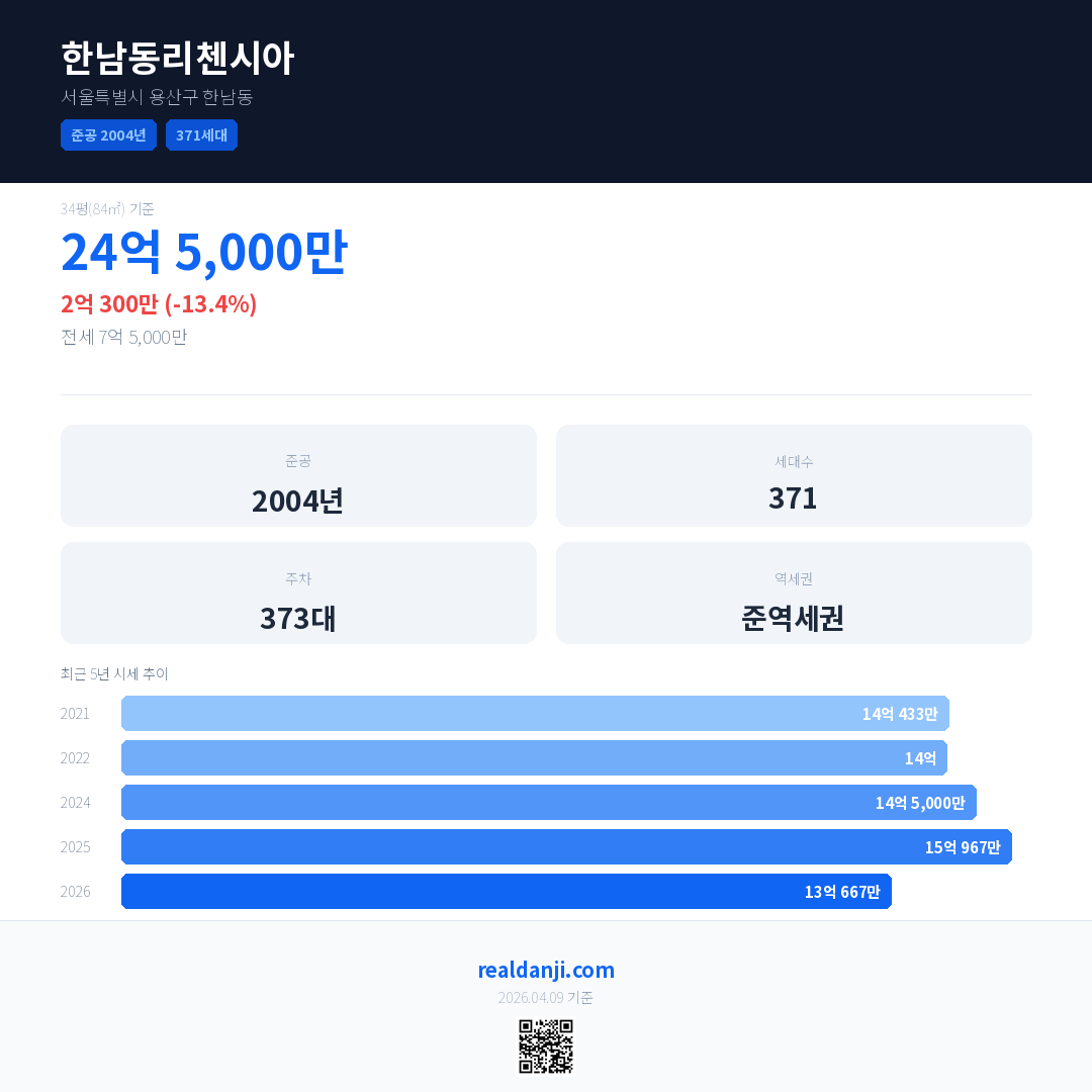 한남동리첸시아 최근 거래가는 13억 5,000만입니다. (2026-03)
