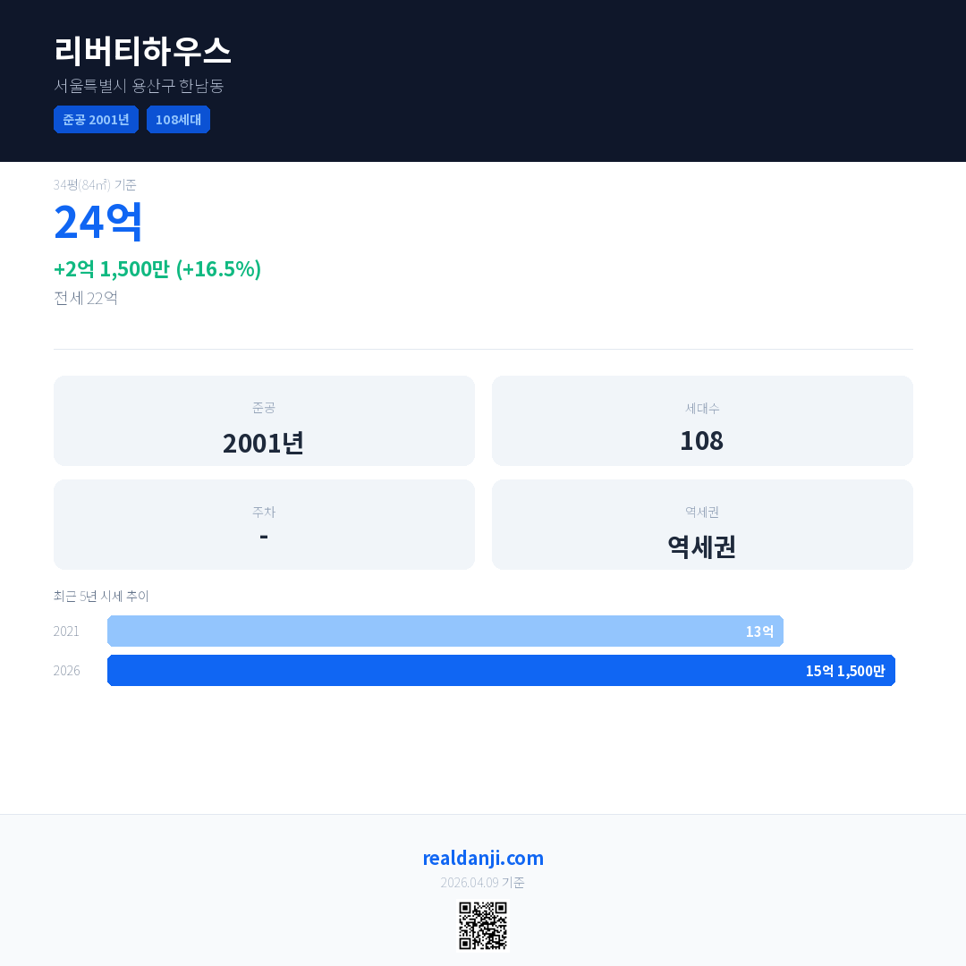 리버티하우스은(는) 2001년에 준공되었으며, 현재 25년차입니다. 총 108세대 규모입니다.