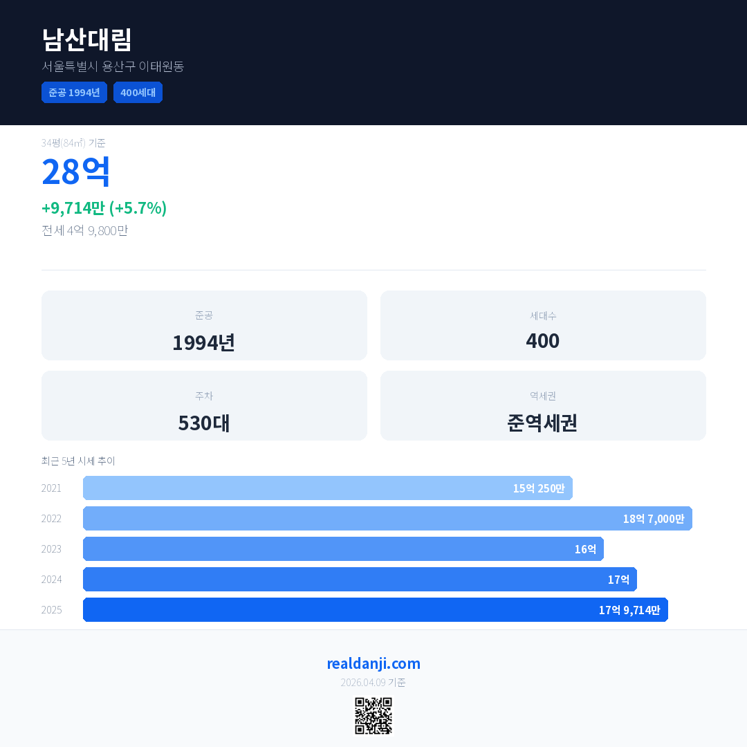 남산대림 최근 거래가는 28억입니다. (2026-02)