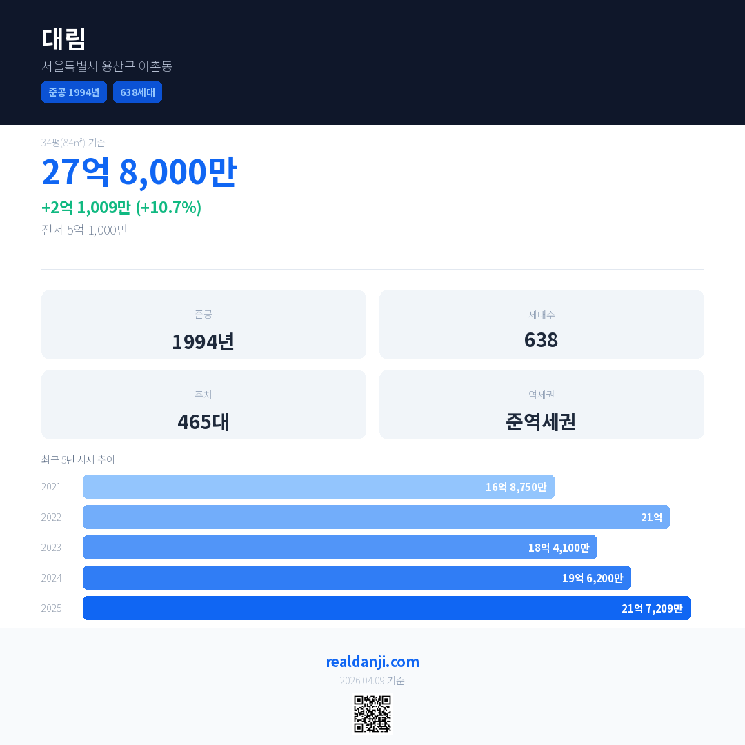 대림 국민평형 기준 2025년 평균 거래가는 21억 7,209만으로, 전년 대비 10.7% 상승 했습니다.