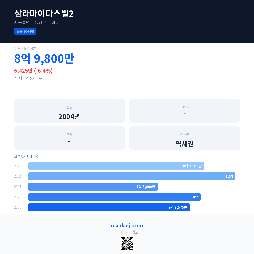 삼라마이다스빌2은(는) 2004년에 준공되었으며, 현재 22년차입니다.