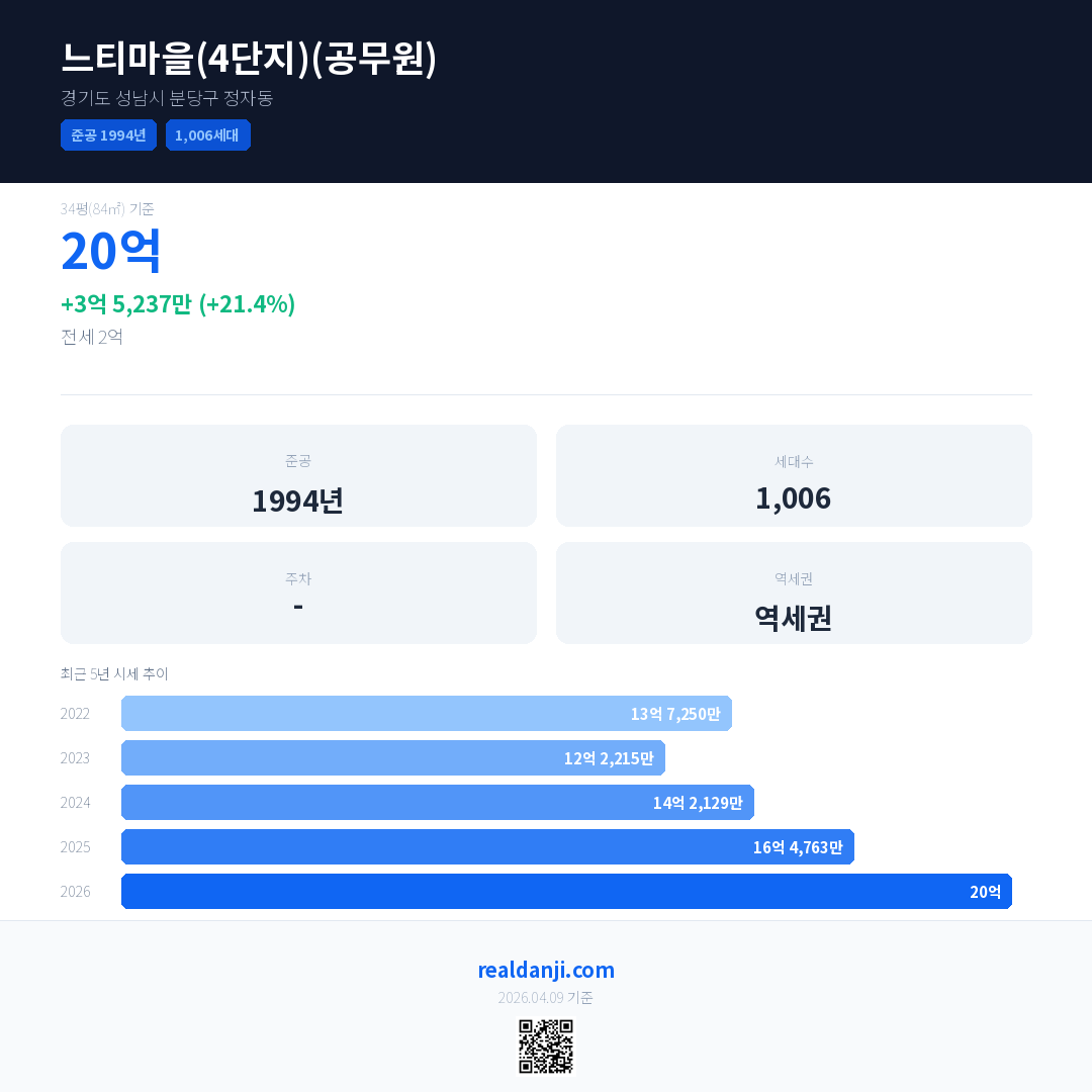느티마을(4단지)(공무원) 국민평형 기준 2026년 평균 거래가는 20억으로, 전년 대비 21.4% 상승 했습니다.