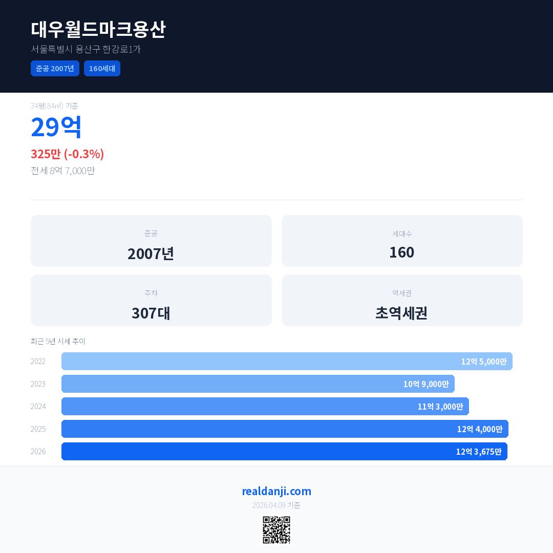 대우월드마크용산 국민평형 기준 2026년 평균 거래가는 12억 3,675만으로, 전년 대비 0.3% 하락 했습니다.