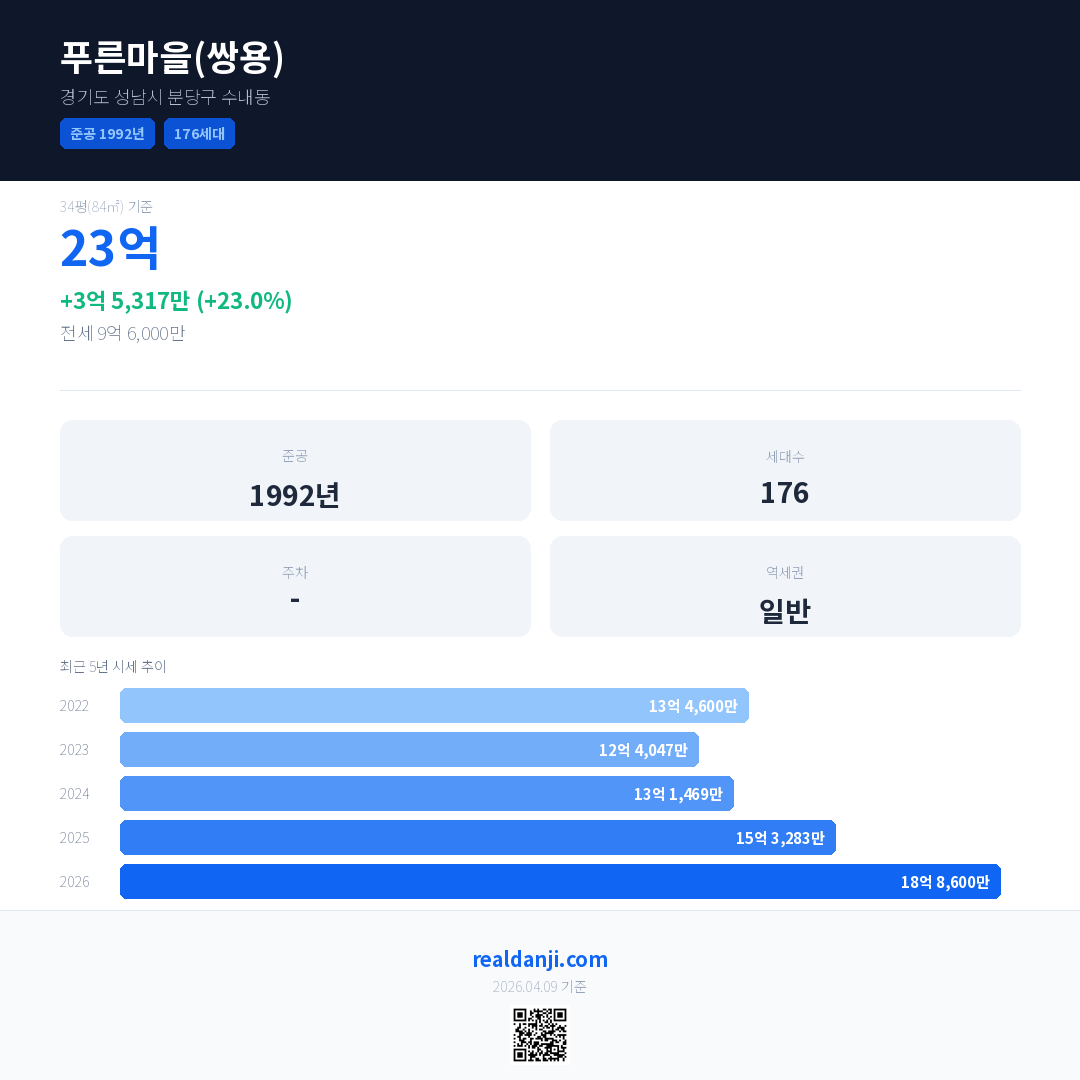 푸른마을(쌍용) 최근 거래가는 23억입니다. (2026-03)