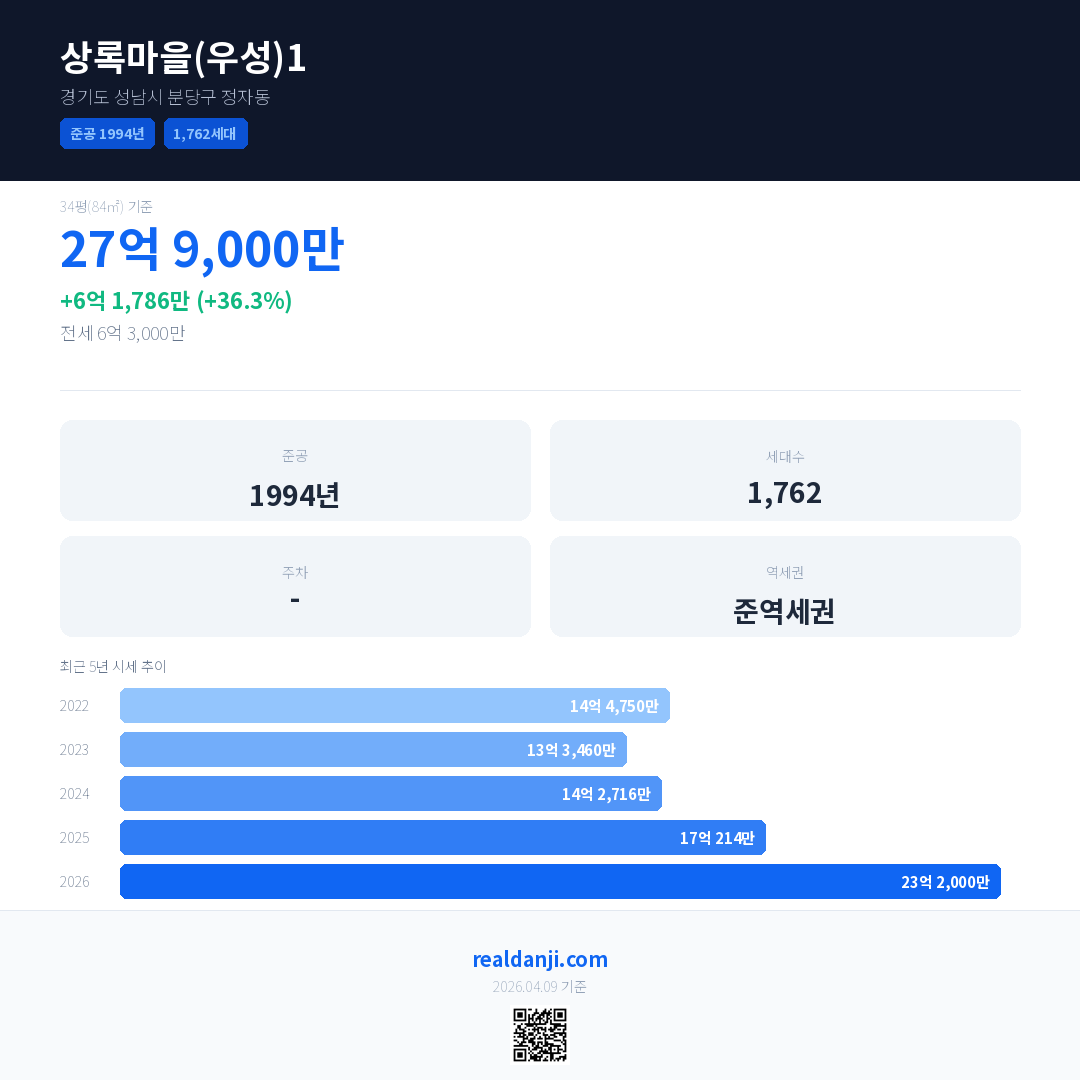 상록마을(우성)1 최근 거래가는 23억 1,000만입니다. (2026-03)