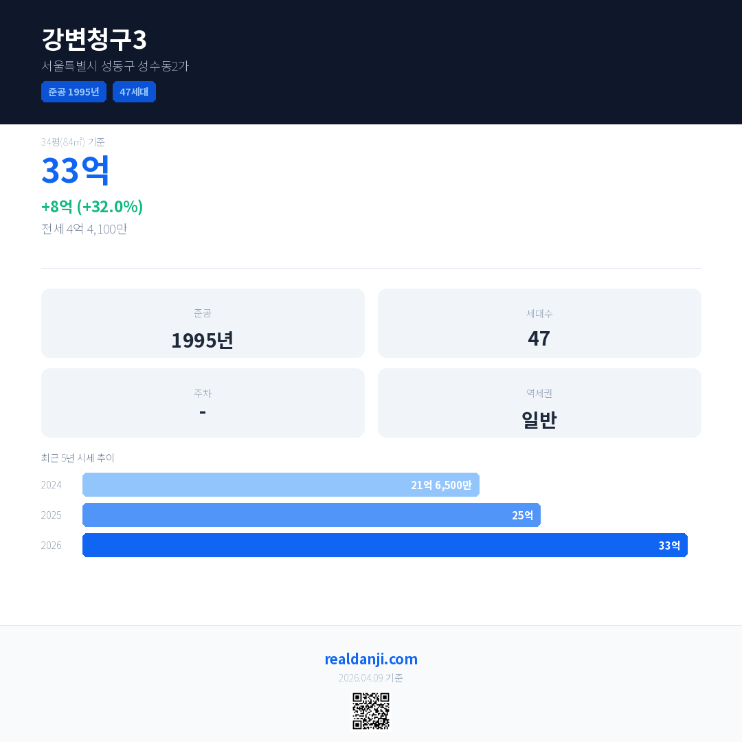 강변청구3 국민평형 기준 2026년 평균 거래가는 33억으로, 전년 대비 32.0% 상승 했습니다.