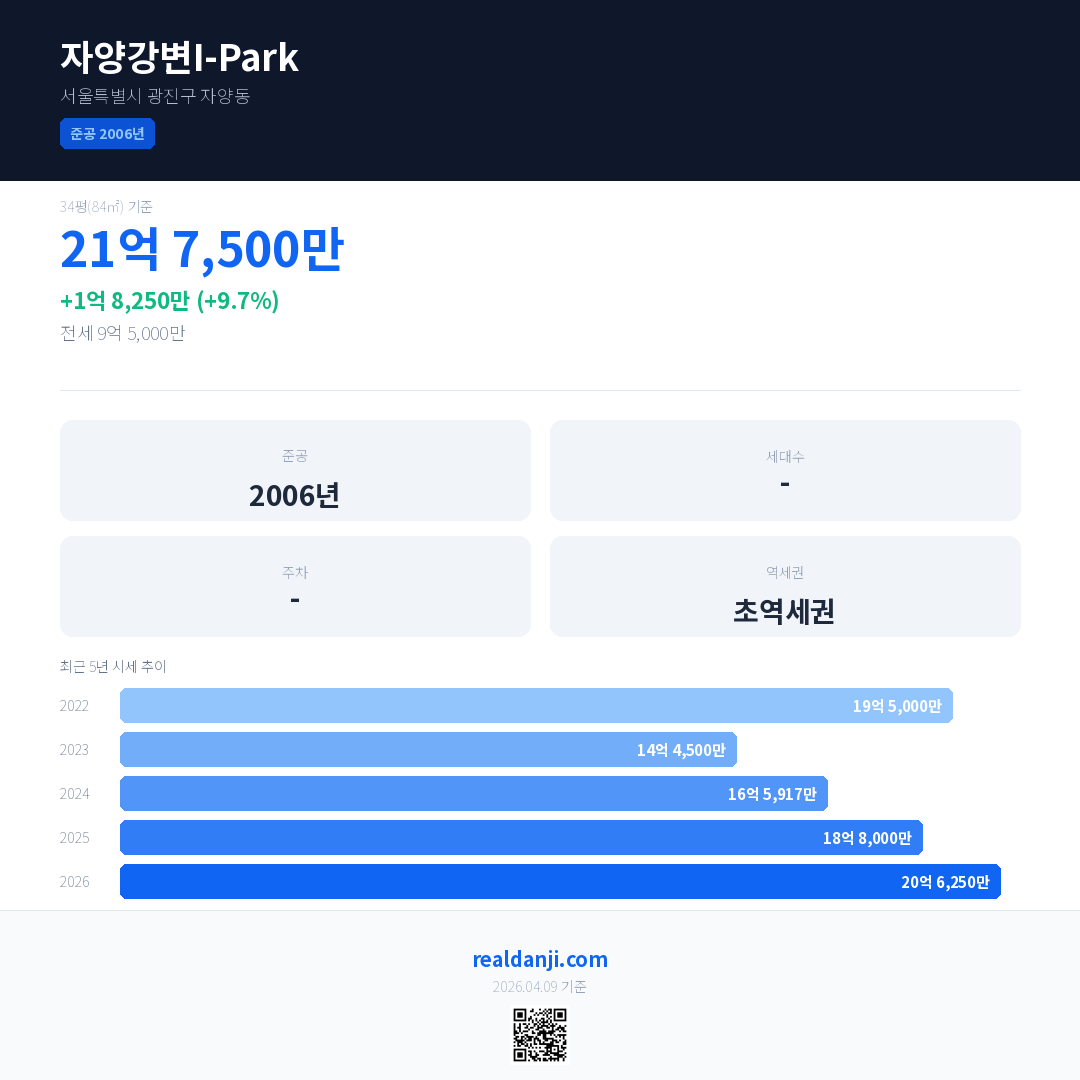 자양강변I-Park 국민평형 기준 2026년 평균 거래가는 20억 6,250만으로, 전년 대비 9.7% 상승 했습니다.