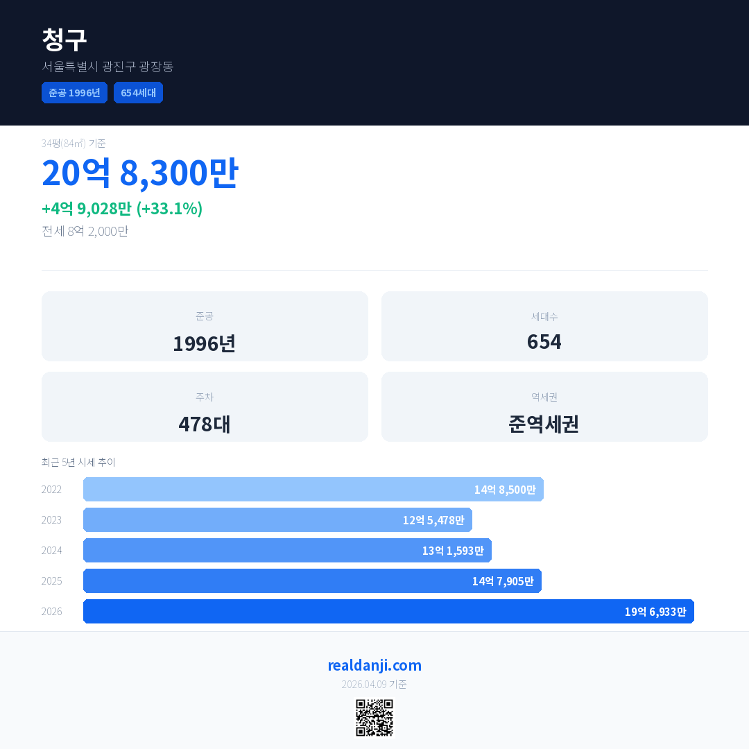 청구 국민평형 기준 2026년 평균 거래가는 19억 6,933만으로, 전년 대비 33.1% 상승 했습니다.