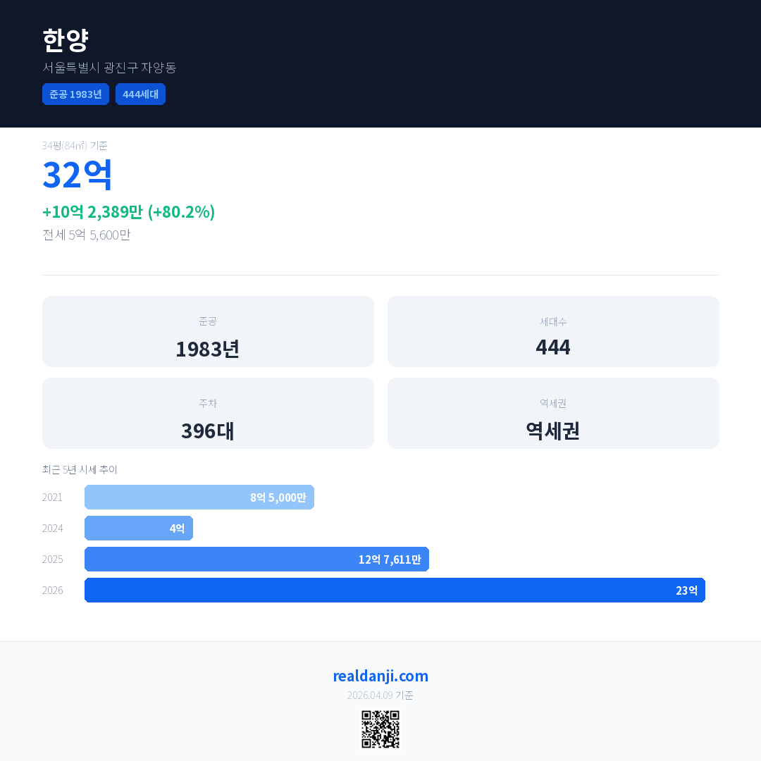 한양 국민평형 기준 2026년 평균 거래가는 23억으로, 전년 대비 80.2% 상승 했습니다.