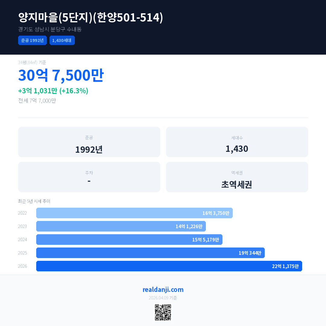 양지마을(5단지)(한양501-514) 국민평형 기준 2026년 평균 거래가는 22억 1,375만으로, 전년 대비 16.3% 상승 했습니다.