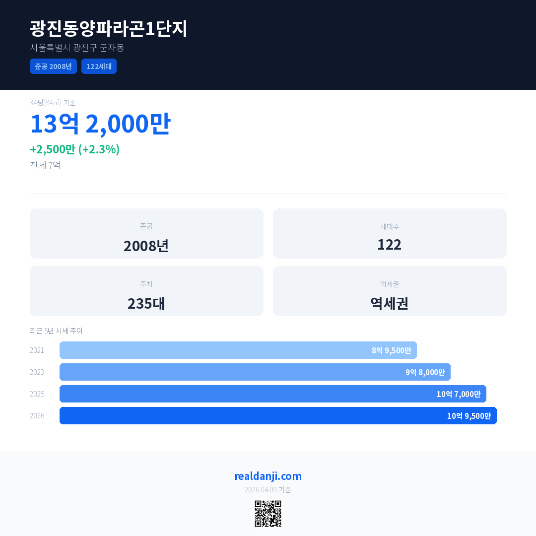 광진동양파라곤1단지 국민평형 기준 2026년 평균 거래가는 10억 9,500만으로, 전년 대비 2.3% 상승 했습니다.