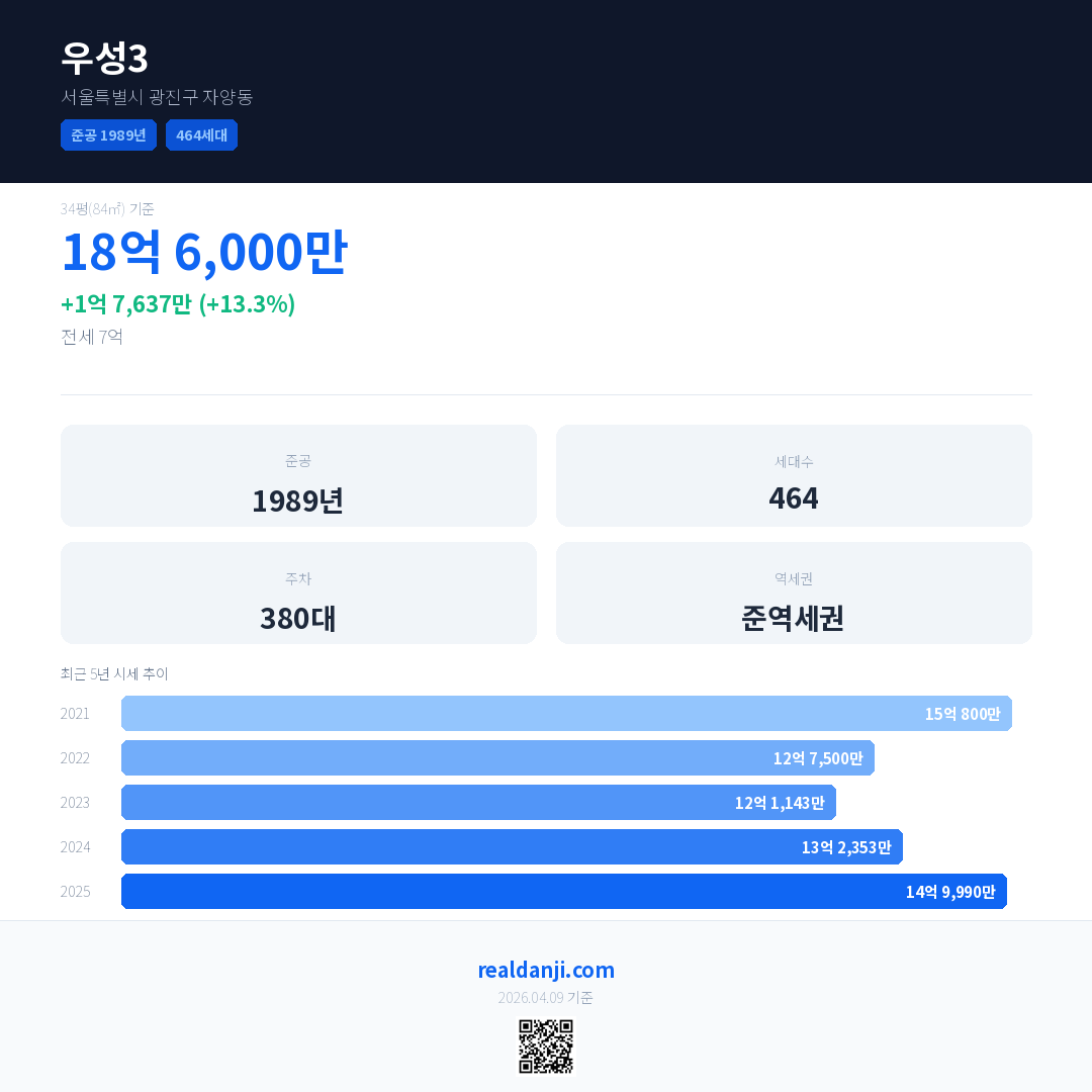 우성3은(는) 1989년에 준공되었으며, 현재 37년차입니다. 총 464세대 규모입니다.