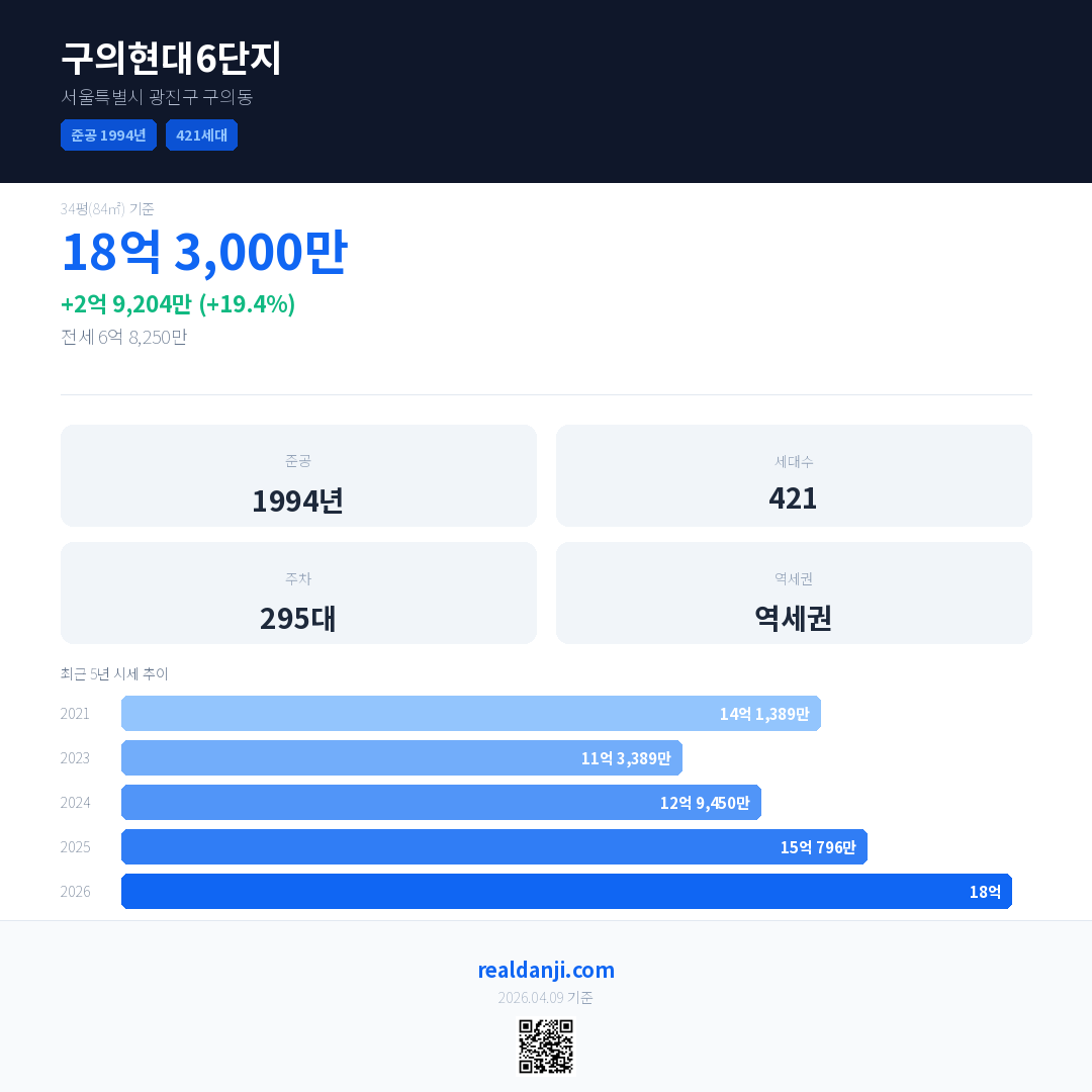 구의현대6단지 국민평형 기준 2026년 평균 거래가는 18억으로, 전년 대비 19.4% 상승 했습니다.