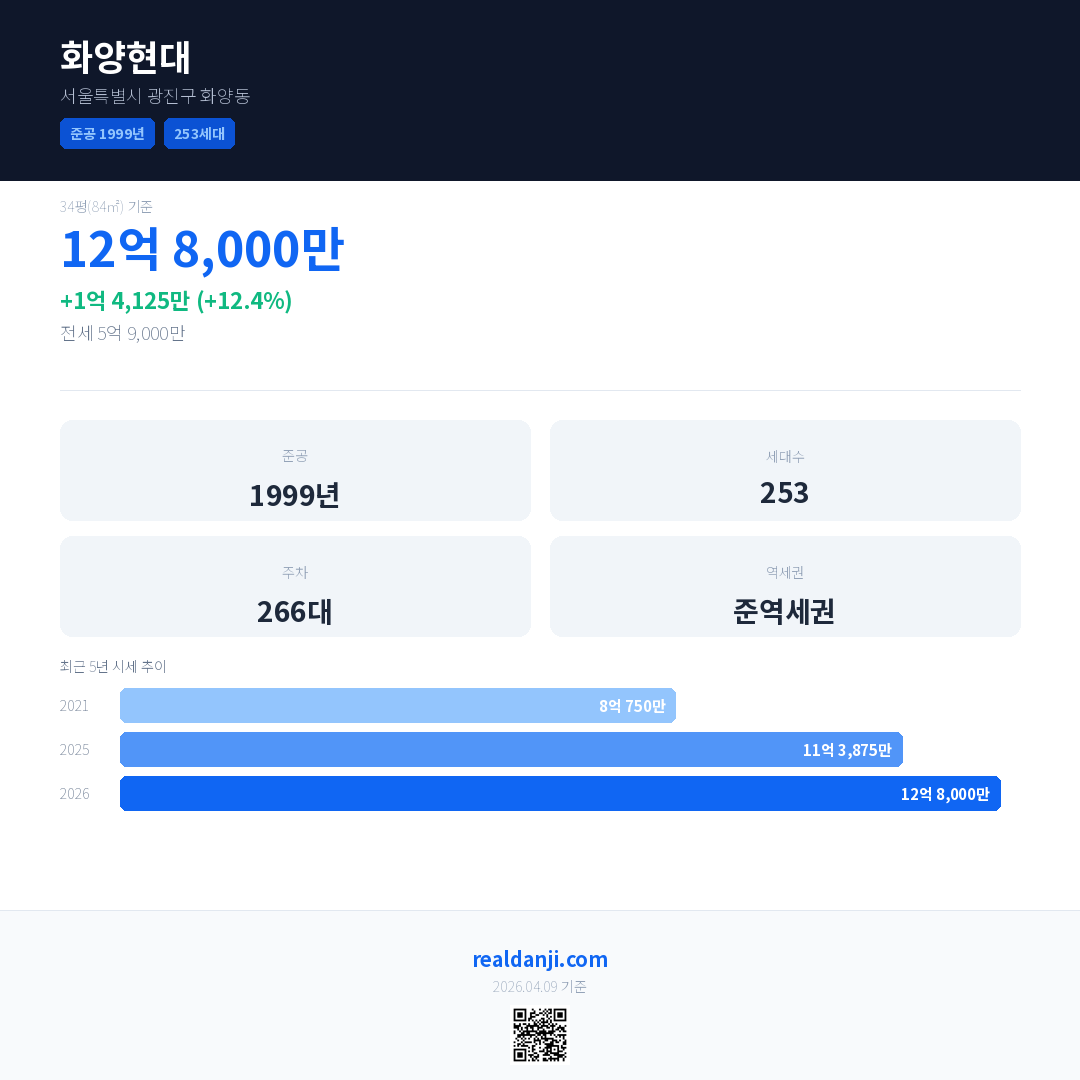 화양현대 국민평형 기준 2026년 평균 거래가는 12억 8,000만으로, 전년 대비 12.4% 상승 했습니다.