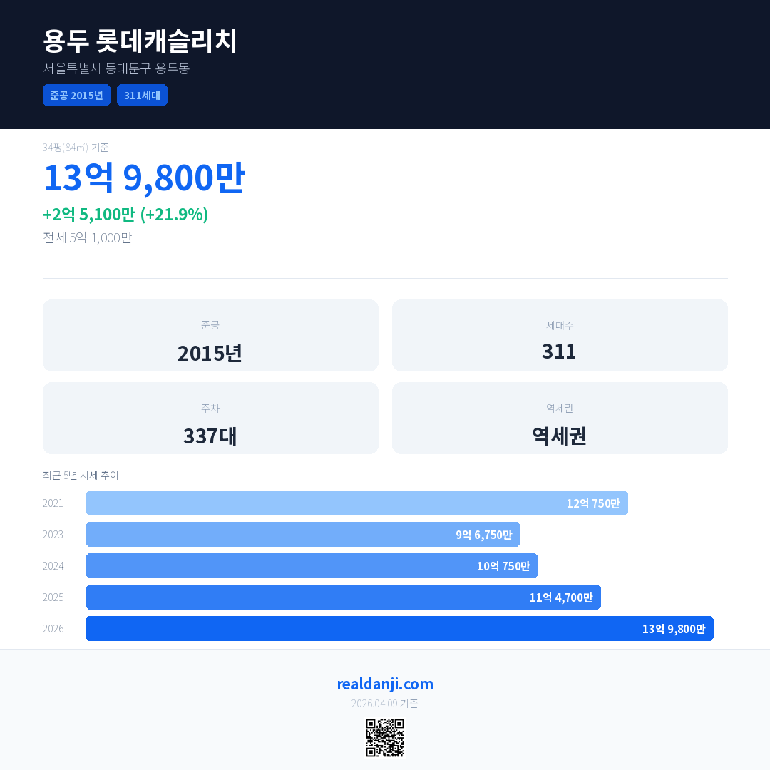 용두 롯데캐슬리치 최근 거래가는 15억입니다. (2026-02)