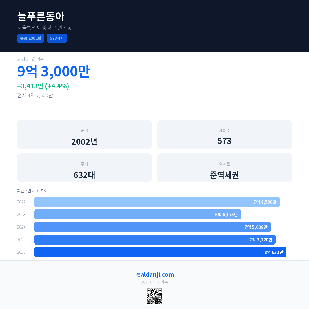 늘푸른동아 국민평형 기준 2026년 평균 거래가는 8억 633만으로, 전년 대비 4.4% 상승 했습니다.