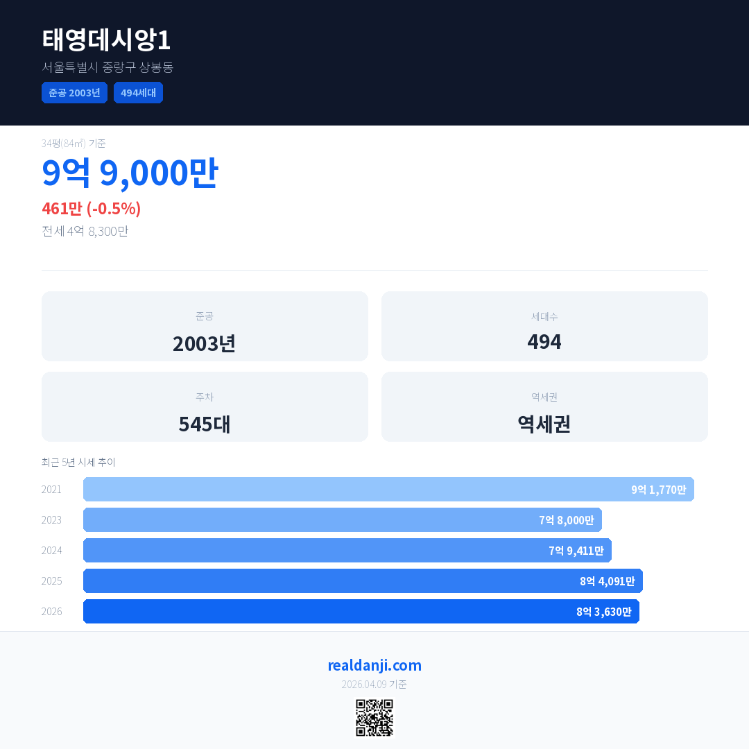 태영데시앙1 최근 거래가는 9억 9,000만입니다. (2026-04)