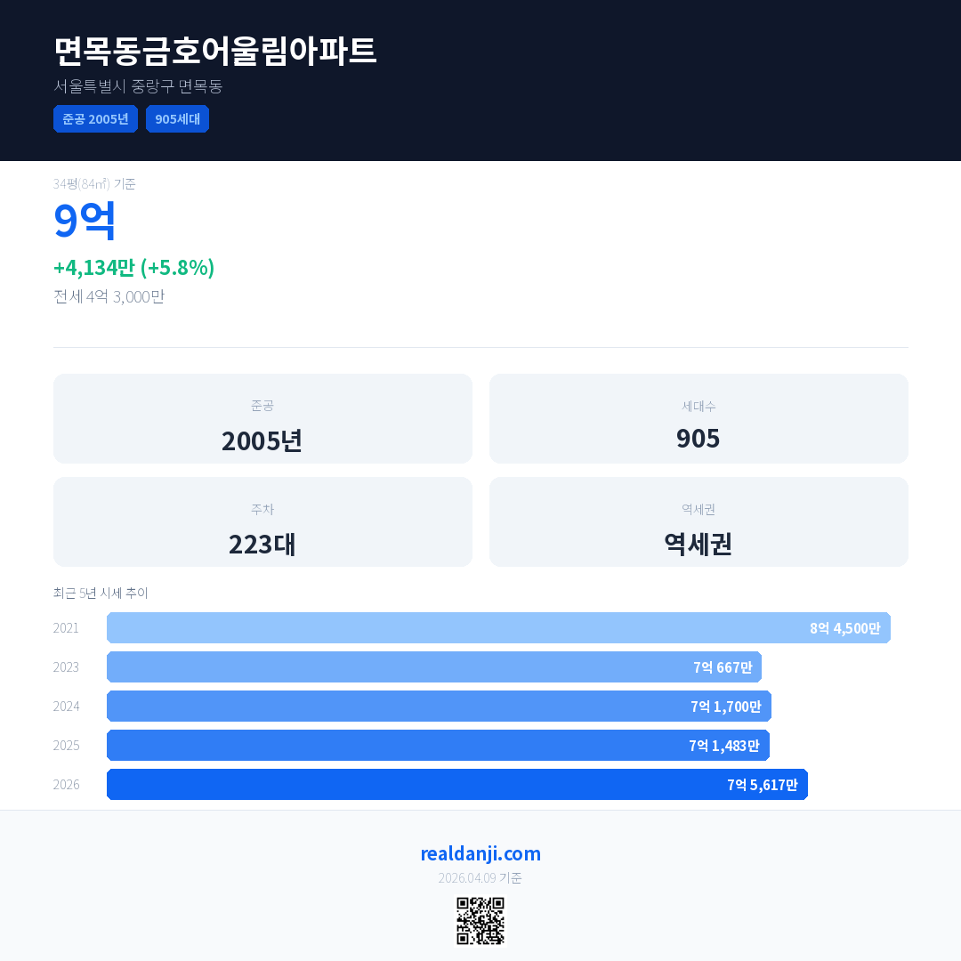 면목동금호어울림아파트 최근 거래가는 8억 1,500만입니다. (2026-04)
