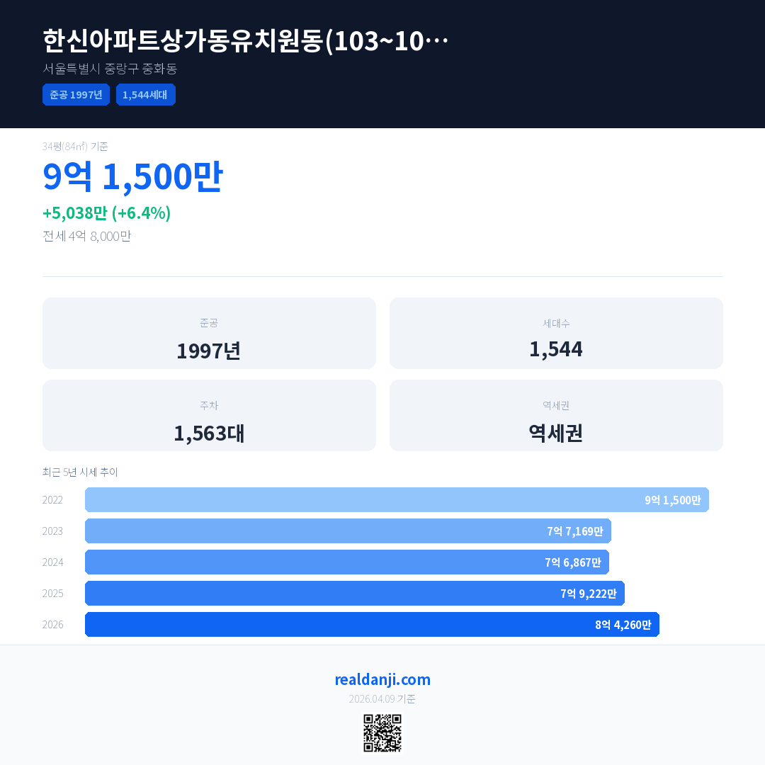 한신아파트상가동유치원동(103~109) 국민평형 기준 2026년 평균 거래가는 8억 4,260만으로, 전년 대비 6.4% 상승 했습니다.