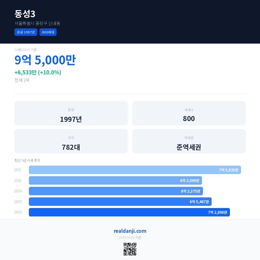 동성3 국민평형 기준 2026년 평균 거래가는 7억 2,000만으로, 전년 대비 10.0% 상승 했습니다.