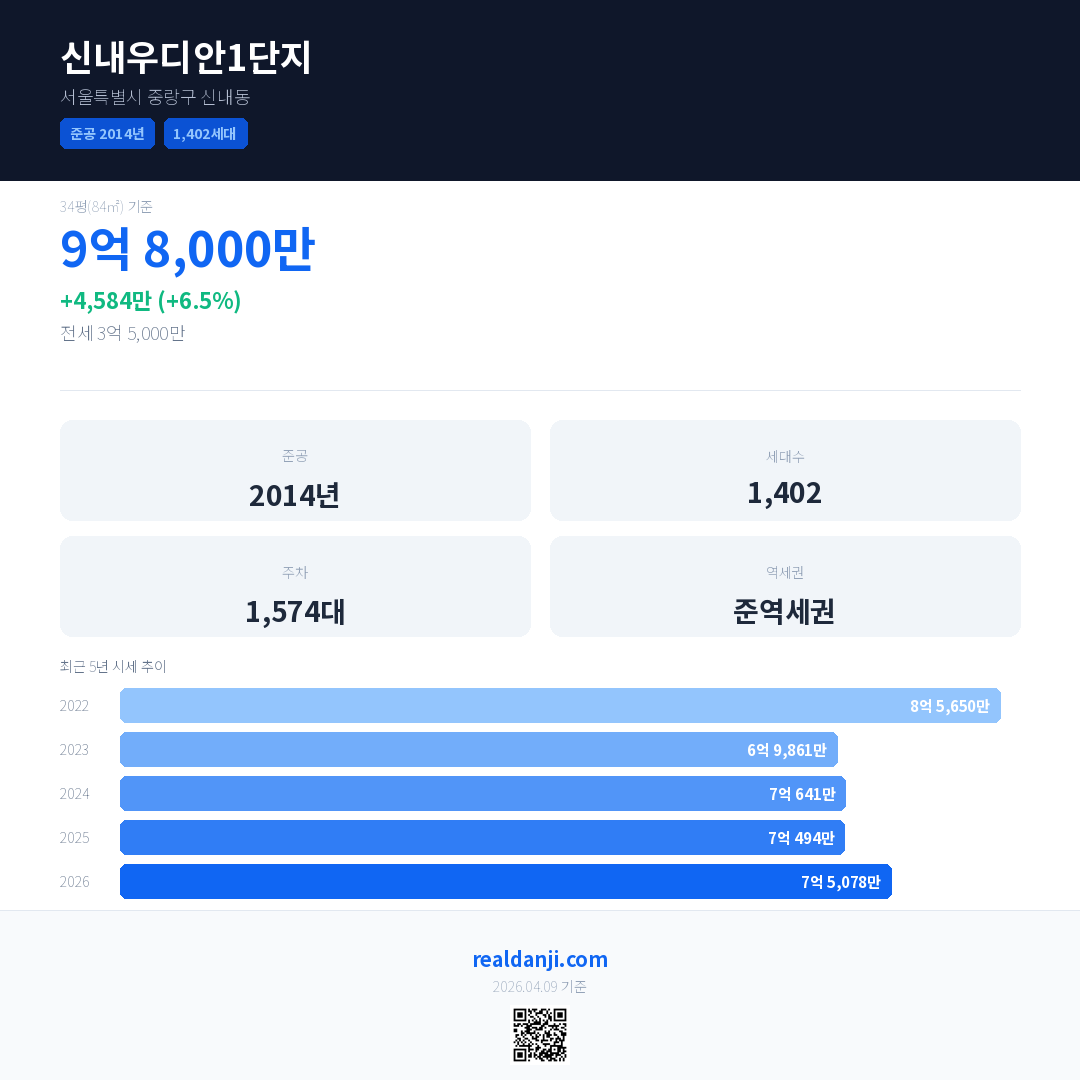 신내우디안1단지 최근 거래가는 9억 8,000만입니다. (2026-04)
